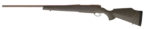 Weighing a mere 5.9 pounds (6-lug Action) SUB-MOA accuracy and durable performance finish this rifle is home in any backcountry situation. The #2 contour fluted barrel cuts precious pounds for backpack trips. The hand-laid fiberglass Monte Carlo stock with aluminum bedding blocks gives this rifle a strong foundation to make the cross-canyon shots when the opportunity presents itself. The spiral fluted bolt body aides in the reduction of weight and the Cerakote® finish on all metalwork guarantees a life of rugged dependability - Fluted Barrel / Brake / Receiver / Trigger Guard • FDE Cerakote - Bolt / Bolt Knob / Safety • Graphite Black Cerakote - Green Hand-Laid raised comb Monte Carlo fiberglass stock with FDE speckle pattern. - Caliber: 6.5-300 Wby Mag - Length of Pull: 13.625• - Monte Carlo: .625• - Drop @ Comb: .875• - Drop @ Heel: 1.625• - Mag Capacity: 3+1 - Weight: 7.2 - Overall Length: 48.625 - Barrel Length & Contour: 26• #2 MOD - Action / Barrel OAL: RH 28• - Twist Rate: 1-8•