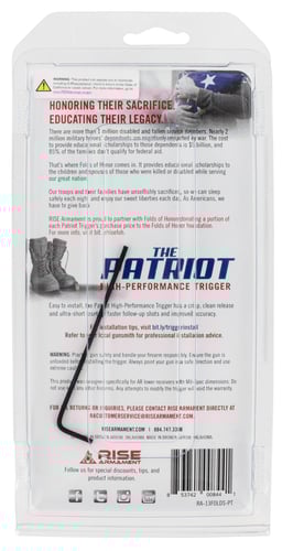 Benefiting Folds of Honor the Patriot High-Performance Trigger by RISE Armament is an easy-to-install accuracy-enhancing rifle upgrade that gives back to veterans and their families. Each trigger purchase helps fund educational scholarships for children and spouses of fallen and disabled service members. - The Patriot Trigger has a crisp clean release and ultra-short reset for faster follow-up shots and improved accuracy. It has a light 3.5-pound pull and straight trigger blade. - A limited-edition item the drop-in trigger group includes a commemorative challenge coin along with free tools and anti-walk pins for fast and easy trigger installation. - Single-stage trigger system with a lightened trigger pull (3.5-lb. pull weight) - Helps you shoot more accurately with less effort - Ultra smooth to the break with a crisp clean release - Incredibly short reset and low overtravel for faster follow-up shots - Premium EXO nickel boron coating on interior parts for reduced friction and smoother contact surfaces - Straight trigger blade for enhanced control and lighter-feeling pull weight - Lightened hammer - Drop safety feature - Includes a commemorative challenge coin which features Folds of Honor on one side and RISE Armament on the other - Includes free anti-walk pins and wrenches for installation - Self-contained design makes it easy and quick to install with no fine-tuning needed - Features a bright red 8625 hardcoat anodized aluminum cassette housing with an American flag design and the Folds of Honor logo - Manufactured and assembled in RISE Armament's Oklahoma facility according to strict AS9100 aerospace requirements which are more stringent than standard gun manufacturing requirements - CNC machined from high-grade heat-treated tool steel and aluminum - Fits .223/5.56 and .308 AR-style platforms with Mil-Spec dimensions - Backed by RISE Armament•s lifetime manufacturing warranty. - Note: The set screw should not be tampered with. Any attempts to modify the trigger will void the warranty. - RISE Armament will donate a portion of each trigger's purchase price to Folds of Honor which provides scholarships for children and spouses of fallen or disabled veterans.